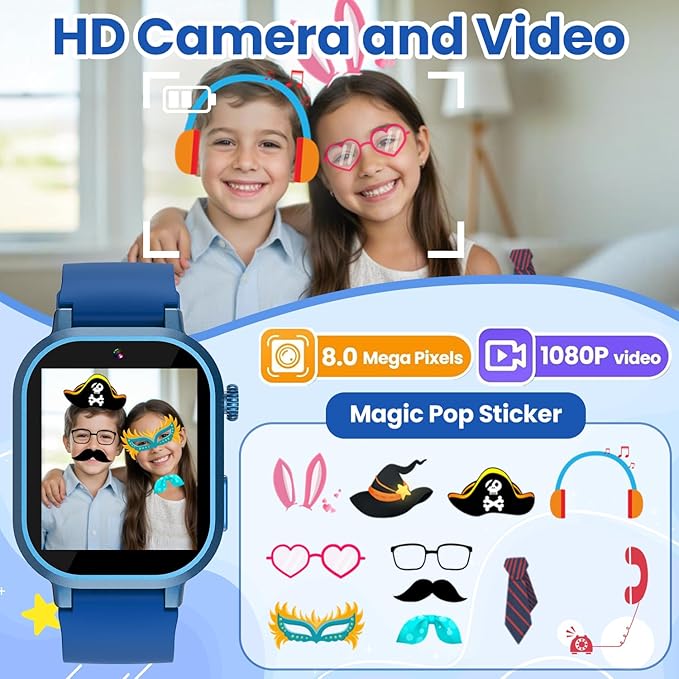 • 【HD Camera & Video】: The kids watch is equipped with a high-definition camera, allowing children to clearly record every happy moment in life. Children can use the built-in cute stickers to take some interesting photos with their families or friends. The smart watch for kids can store 15,000+ photos or 6+ hours of video.