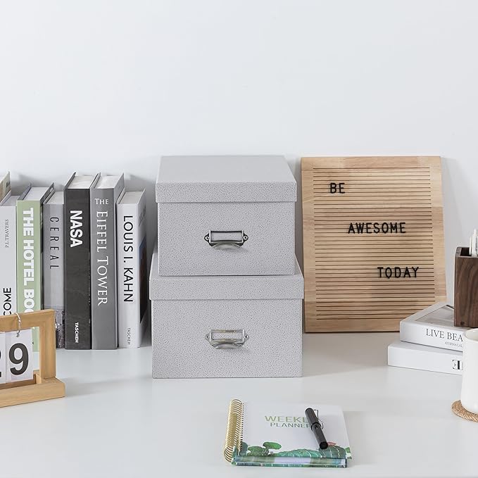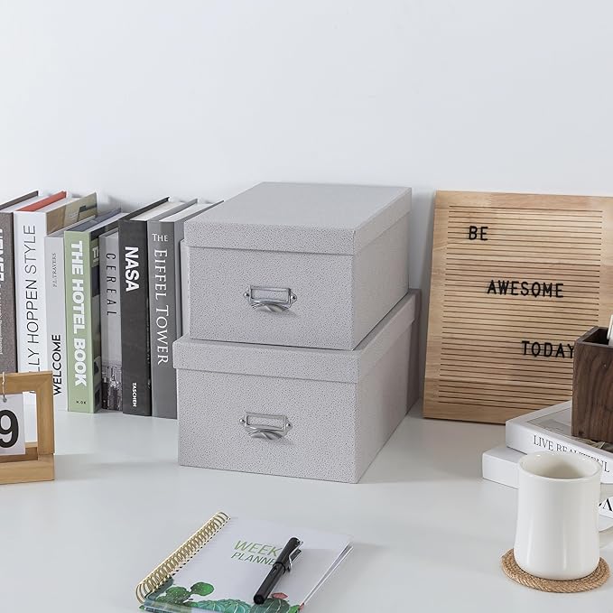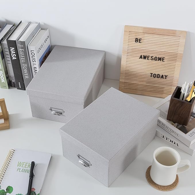 • PREMIUM KEEPSAKE STORAGE BOX: Each decorative storage box is crafted from durable paperboard with a textured finish. The subtle gray color complements any décor while the metal hardware adds vintage charm to these keepsake box organizers.