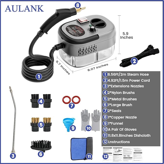 • 【Attachments & Service】 You can get: 1 x steam cleaner machine with tank, 1 x 2m steam pipe, 1 x 1.5m power cord, 1 x Extended Sprayer Rod, 2 x cooper brush, 2 x nylon brush, 1 x big nylon brush,1x towel,1xfunnel, 1 x Glove, 2 x waterproof gasket and 1 x user manual. Meanwhile, if you find any parts are damaged after receiving a product or you have other questions, please feel free to contact with us and we will get back to you within 24 hours.