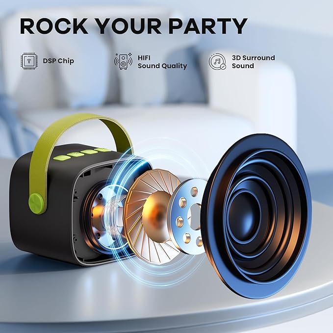 • PLAY ANY SONG - Instant Bluetoothed to your Smartphones and tablets with great stability, and play all your favorite songs. From then on, it connects automatically. One Simple Setup, tiny fingers can power up the magic in seconds. Also support TF card (not included) playing. At the same time, plug in your headphones, sing and listen to your own singing voice, good helper for singing practice. Moreover, one key to reduce or restore vocals from Bluetooth music, sing along with the rhythm and have fun.