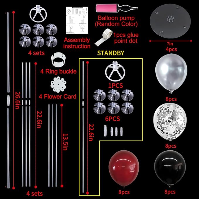 • Included Components : Balloon Stand, Burgundy Red Black Silver Balloons, Filling Pump, Glue, Tying Tool