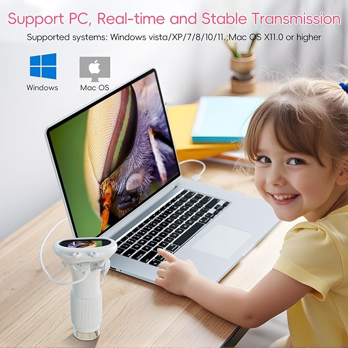 • PC Connection & fun sharing: The USB digital microscope can be connected to a computer via the included USB cable for large-screen real-time viewing, supporting Windows Vista/XP/7/8/10/11, MacOS X 11.0 or later; or save and share kids' explorations and discoveries with family and friends.