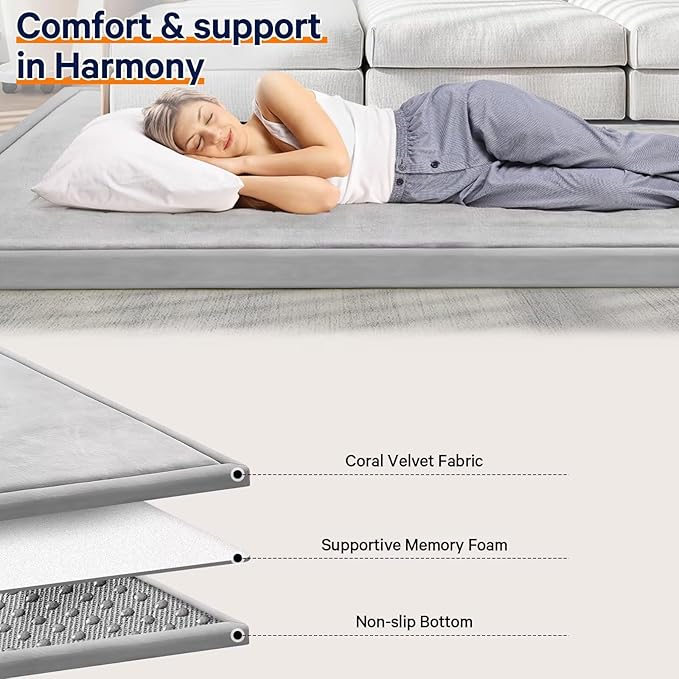 • 🐣SAFE & COMFY: Our baby play mat is made of 100% coral velvet material and filled with high-quality 3cm thick memory foam,eco-friendly and durable, providing a safe and comfortable play area for your little ones, without worrying about them hurting themselves on hard floors.The surface of this floor mat is velvet cover, which is not only soft and comfortable to touch, but also has a good cushioning effect.