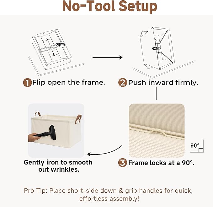 • Premium Quality: Made from high-quality fabric and reinforced with a heavy-duty MDF bottom board and a sturdy metal frame. The solid construction enables the storage bins to stand upright without support, even when empty.