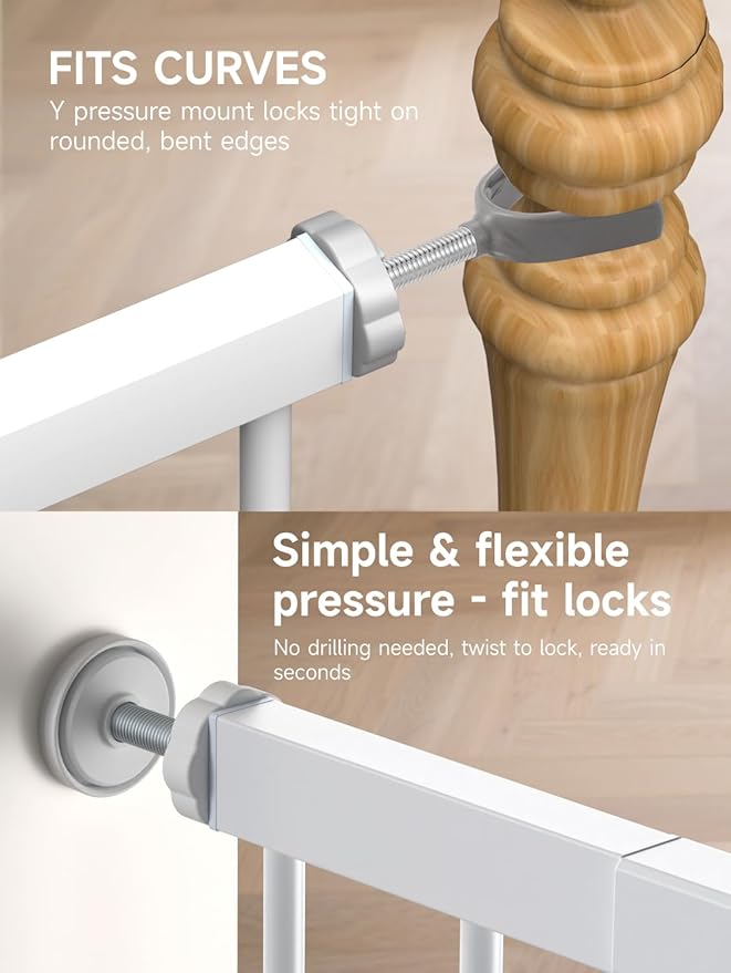 • Keep Your Little Ones and Pets Safe: PLZOIT extra wide baby gate for stairs is made of all-metal structure, it can withstand impacts from pets. Don't need to worry about baby gates with door being pushed down and hurting your children or dogs. The pet gate is chew-proof, lead-free and non-toxic, providing a secure barrier wherever you need it. Ideal for a family with children and pets