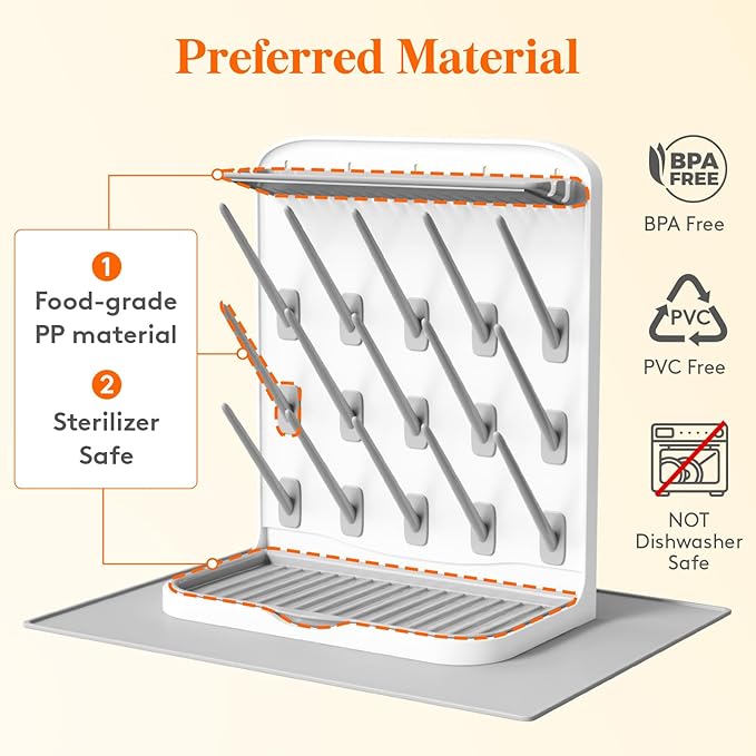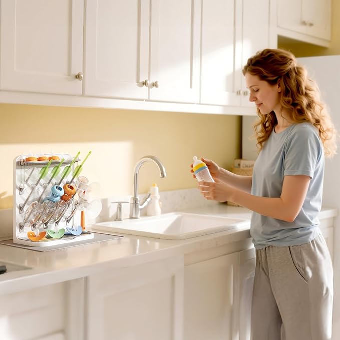 • All-in-One Baby Bottle Drying Rack: This drying rack features 15 pegs that accommodate 4-5 sets of bottles of all sizes and accessories, including nipples, straws, pacifiers, valves, lids and breast pump parts, offering a space-saving storage solution