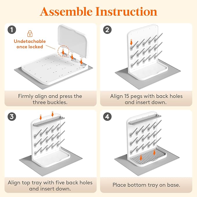 • Detachable Design: The top pacifier tray, bottom drain tray, and 15 pegs are removable. The pacifier tray holds up to 5 pacifiers and features holes on two sides for gravity balls. The drain tray collects water droplets and store bottle caps and brushes