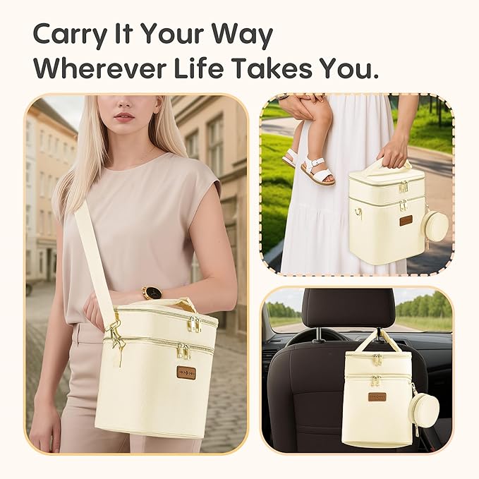 • 1️⃣ Large Capacity for Pumping Moms Holds up to 6 standard 9oz bottles in the bottom compartment. The top layer stores wearable pumps, snacks, or accessories—perfect for daily use or long outings