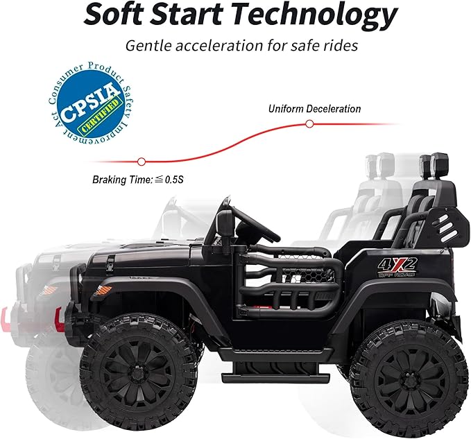 • DURABLE & SAFE RIDE: This battery operated kids vehicles features a 16mm solid steel axleand supports up to 150 lbs. With four-wheel suspension and soft-start, it ensures a smooth, safe ride for endless fun!