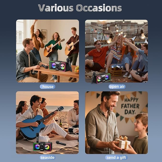 • PARTY ATMOSPHERE AND LIGHTING EFFECTS :Dynamic LED lights sync with music or stay static, creating a fun party vibe. One-touch sound effects (applause, laughter, cheers) add extra fun for kids and family. Perfect for birthdays, BBQs, or karaoke nights. Lights can be turned off with one button for a quieter setting