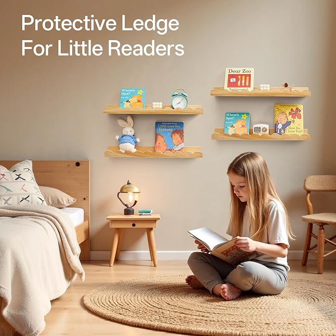 • 【🏡Stylish Scalloped Design】 This scalloped floating shelves has a scalloped rounded front with smooth rounded corners and a minimalist design that is child friendly to use while adding a touch of sophistication to any room. Perfect for organizing bookshelf, toys and school materials, this nursery book shelves can also be used as children's room décor to add a cute and fun element to their room
