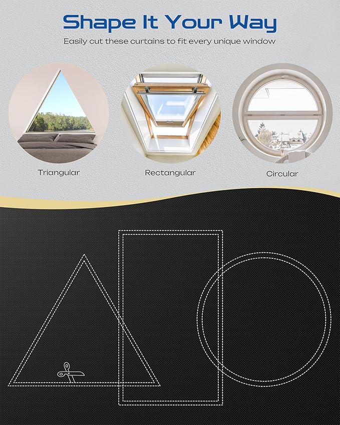 • Multiple Sizes Available - Offering a range of width and height specifications to precisely fit various window types, from small bathroom windows to standard bedroom windows and large living room floor-to-ceiling windows. It is recommended to choose a width 2–5 inches wider than the window and a length with a 1–2 inch drape. Combined with the hook-and-loop tapes to seal the edges, it achieves 100% light-proof shading