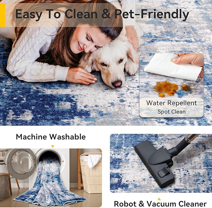 • Tides Series – Effortless style that flows with your life.This modern machine-washable non-slip rug features reinforced edges and a low-pile design that resists dirt. Its water-repellent surface makes spills easy to clean - liquids bead up for quick wiping. Simply machine wash in cold water (no bleach) to refresh. The non-slip backing keeps it securely in place. A perfect blend of function and contemporary design for active homes.
