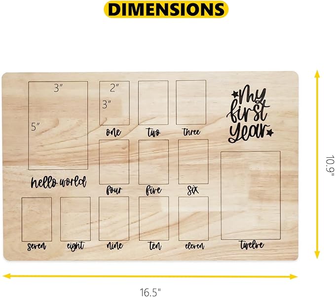• SIZE & MATERIAL --- My first year milestone board measures 10.9" high x 16.5" wide. Made from Approx. 1/3"-thick premium wood, it's smooth, reusable, and resistant to fading or peeling. It fits 2" x 3" photos (wallet size) and is easy to use.