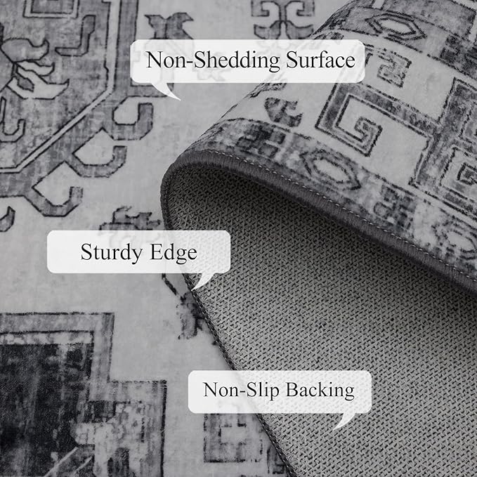 9x12 Area Rug Living Room Rugs, Stain Resistant Washable Rug, Vintage Large Non-Slip Backing, Low Pile Lightweight Print Rug for Bedroom Dinning Room Home Office (Medium Gray)