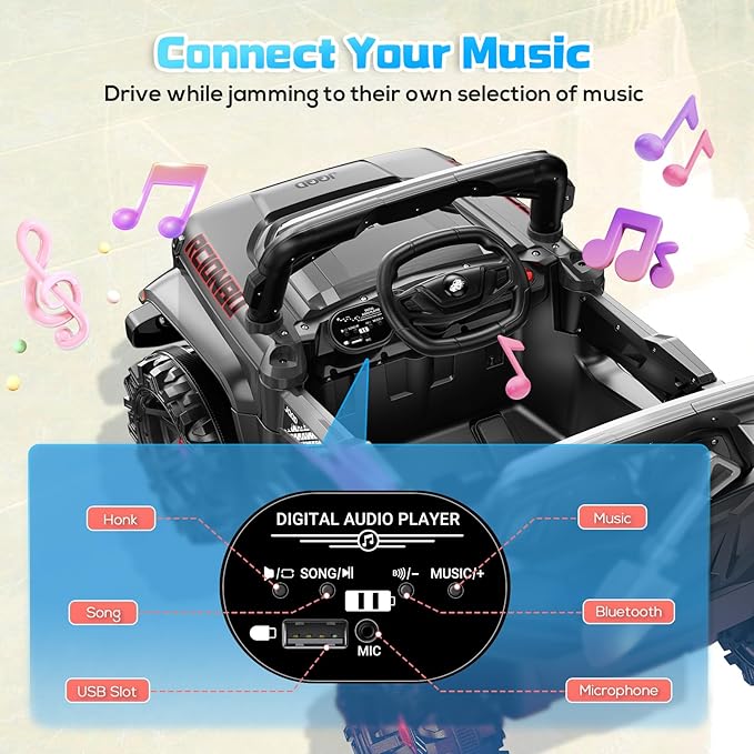 • MULTIPLE AND JOYFUL FUNCTIONS: Our 12V ride on car has a built-in music player, can connect Bluetooth and USB, the little drivers can enjoy songs and stories while driving. In addition, the start button, lighting control, music player and speed button are all very user-friendly, adding an extra layer of enjoyment to the driving experience.