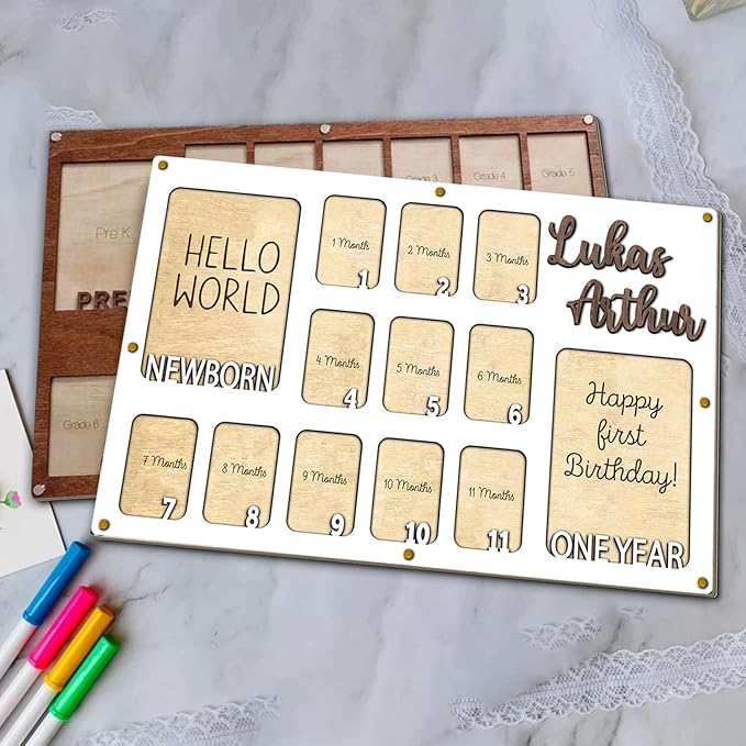 • Capture your baby’s first year with our babys first year photo frame. This baby first year photo frame helps you record their growth from newborn to one year, showcasing each milestone in a 12 month picture frame for baby first year. The wooden plaque includes space for your baby’s full name, making it a personalized keepsake. Our my first year photo board, one year photo board is a wonderful way to celebrate these moments, and the nursery picture frames add a special touch to any room.