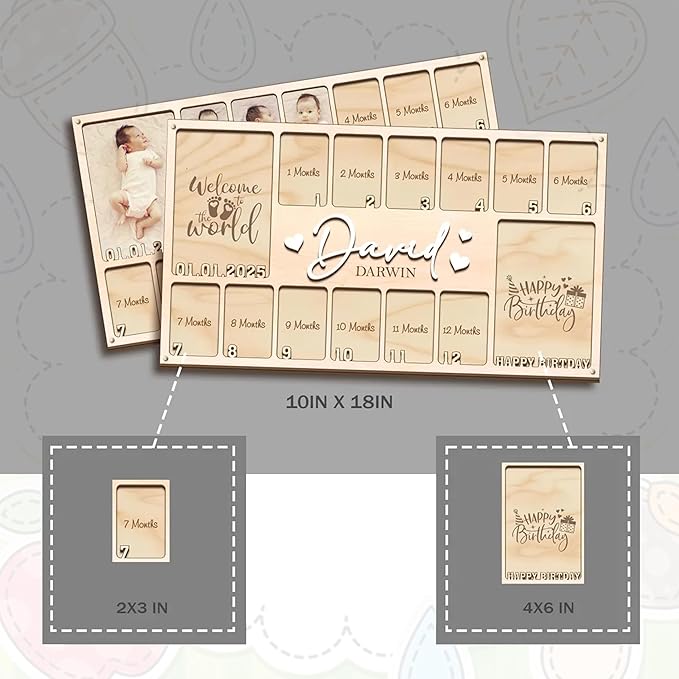 • My First Year Photo Frame: Capture your baby’s first year with our babys first year picture frame. This baby first year photo frame helps you record their growth from newborn to one year, showcasing each milestone in a 12 month picture frame for baby first year. The wooden plaque includes space for your baby’s full name, making it a personalized keepsake. Our 12 month pictures for baby first year, my first year photo board, one year photo board is a wonderful way to celebrate these moments.