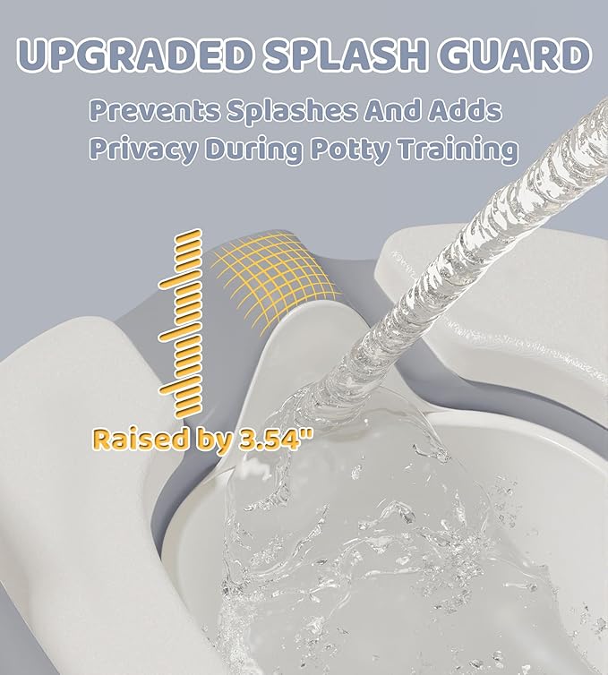 • 【Splash Guard & Urinal Design for Boys】Includes an extended splash guard with a 2.8-inch deep arc recess to prevent spills, ideal for boys during potty training. The urinal-style front makes it easier to keep things tidy and mess-free, promoting better hygiene and easier cleanup.