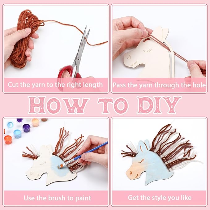 • 24 Set Wooden Horse Cutout Kit: unleash your imagination with this complete wooden horse craft kit; It includes 24 unfinished horse cutouts, 2 sets 12 color paints, 4 paintbrushes, 8 rolls of yarn in different colors, ready to be transformed by your creativity
