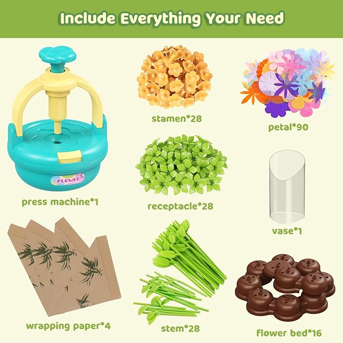 • All in One Kits:This flowers market crafts toy includes press machine,flower bed,receptacles,stem,stamens,vase,flower wrapping paper,petals.The base of the flower press is detachable and can be used for storage.The rich accessories allow children to freely unleash their imagination and embark on a creative floral art journey
