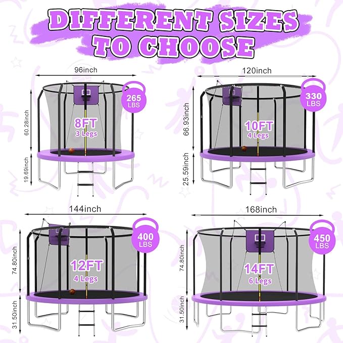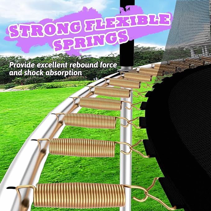 • Durable & Easy to Install: Our trampoline constructed with a galvanized steel frame and premium powder-coated T-connectors to withstand all weather conditions while supporting up to 450 lbs. The unique screwless clip design reduces assembly time by 25% compared to traditional screw installations, letting you quickly set up your trampoline outdoor