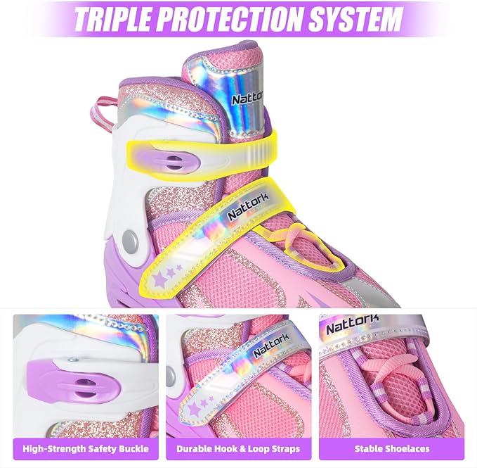 • SIZE ADJUSTABLE: With the ease of size adjustment at the touch of a button, it's easy for kids to put on/take off. These skates can grow with your child because the shoes can be adjusted to four sizes. Nattork inline skates are available in three sizes: S(10C-13C)/M(1-4)/L(5-8), please check our size chart for the specific length of the shoes