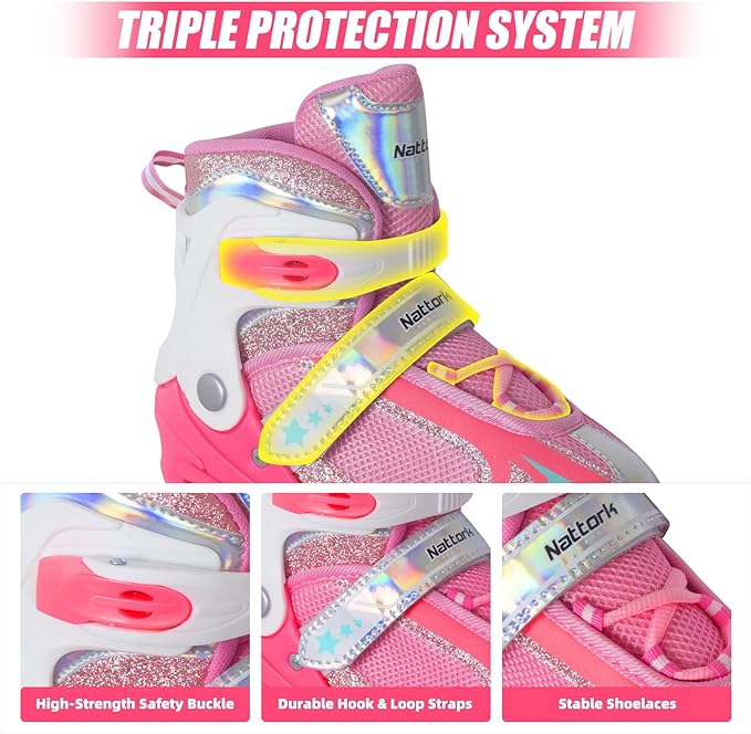 • PERFECT BIRTHDAY/CHRISTMAS GIFT: Nattork inline skates can be a perfect birthday/Christmas gift for your kids, grandchild or nieces and nephews. The kids will have a happy childhood and great gifts. Affordable for beginners, we aim to provide a high quality experience. Suitable for over 4 years old children