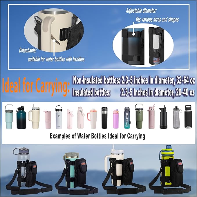 • Adjustable Fit & Wide Compatibility – The water bottle bag adjusts and locks securely to Fits most standard water bottles on the market: works for non-insulated bottles (2.3–5 inches in diameter, 32–64 oz) and insulated bottles (2.3–5 inches in diameter, 20–40 oz)