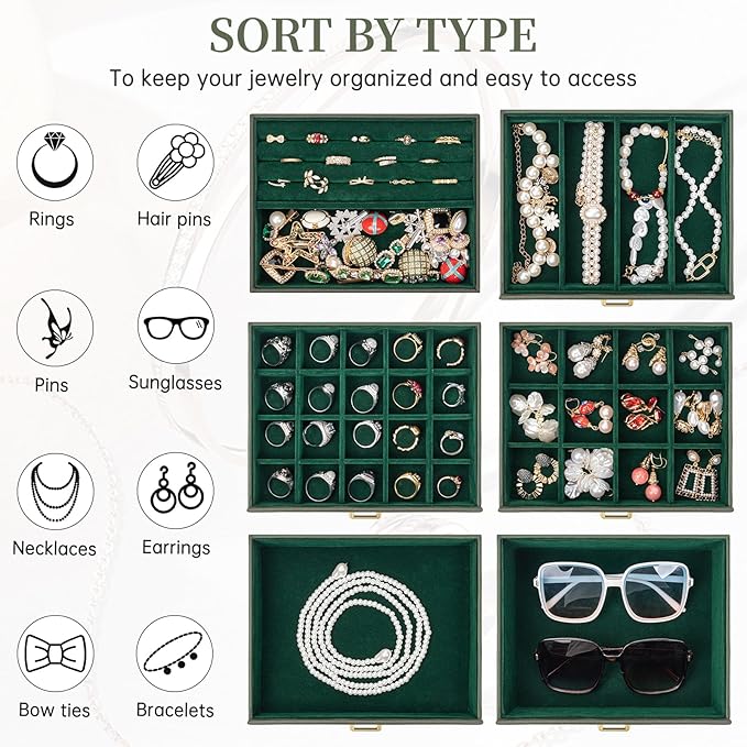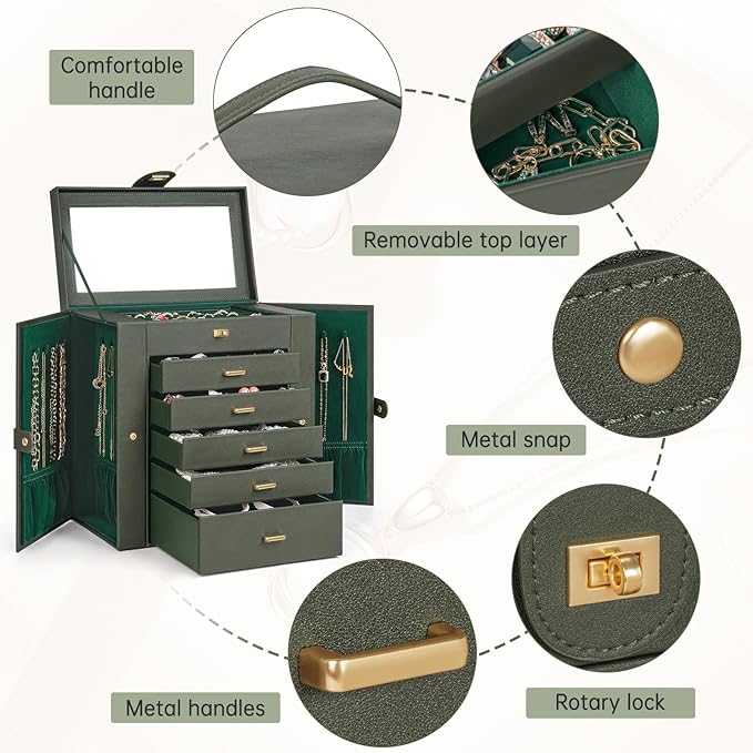 • LARGE CAPACITY:With 6 versatile pull out drawers, this huge jewelry box can store a lot of jewelry accessories, such as rings, earrings, necklaces, chains, bracelets, and so on. One deeper drawer is designed for sunglasses or large jewelries.