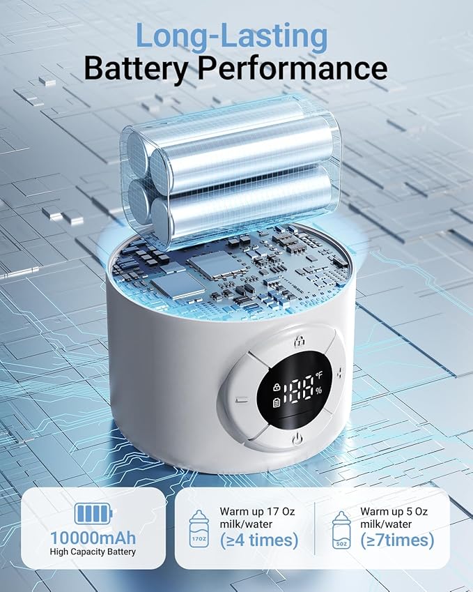• ๐…๐š๐ฌ๐ญ ๐‚๐ก๐š๐ซ๐ ๐ข๐ง๐  & ๐‹๐จ๐ง๐ -๐‹๐š๐ฌ๐ญ๐ข๐ง๐  ๐๐š๐ญ๐ญ๐ž๐ซ๐ฒ: Equipped with a 10000mAh battery, this USB-C fast charging bottle warmer can warm up to 7 bottles (5oz each) on a full charge. Get an 80% charge in just 1.5 hours with a fast-charging adapter of 18W or higher, ensuring all-day power for your travel needs. โš ๏ธ๐ˆ๐ฆ๐ฉ๐จ๐ซ๐ญ๐š๐ง๐ญ ๐๐จ๐ญ๐ž: It's not recommended to use the bottle warmer while charging to avoid low heating efficiency