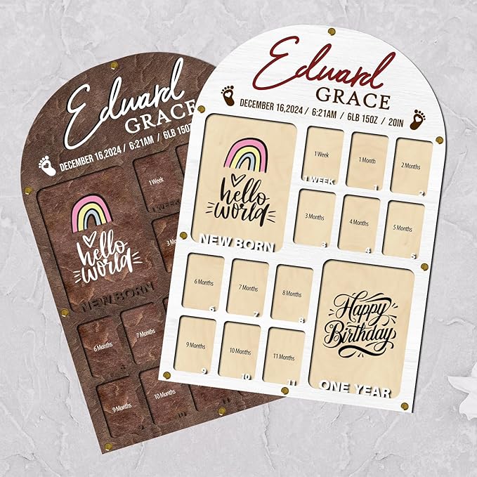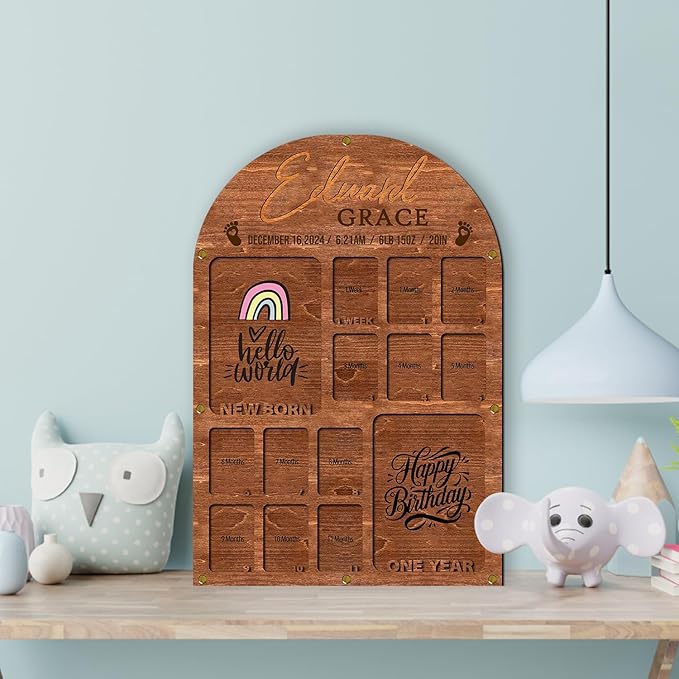 • My First Year Photo Frame: Capture your baby’s first year with our babys first year picture frame. This baby first year photo frame helps you record their growth from newborn to one year, showcasing each milestone in a 12 month picture frame for baby first year. The wooden plaque includes space for your baby’s full name, making it a personalized keepsake. Our 12 month pictures for baby first year, my first year photo board, one year photo board is a wonderful way to celebrate these moments.