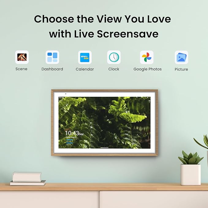 • Smart Photo Frame, Without Subscription — 21.5" HD touchscreen with anti-glare, adaptive auto-brightness, and eco-friendly sleep mode. Certified Amazon Climate Pledge Friendly, crafted with sustainable materials. Wooden frame for wall mounting, transforms into a smart photo frame or live screensaver—sync with Google Photos or upload directly, no subscription required.