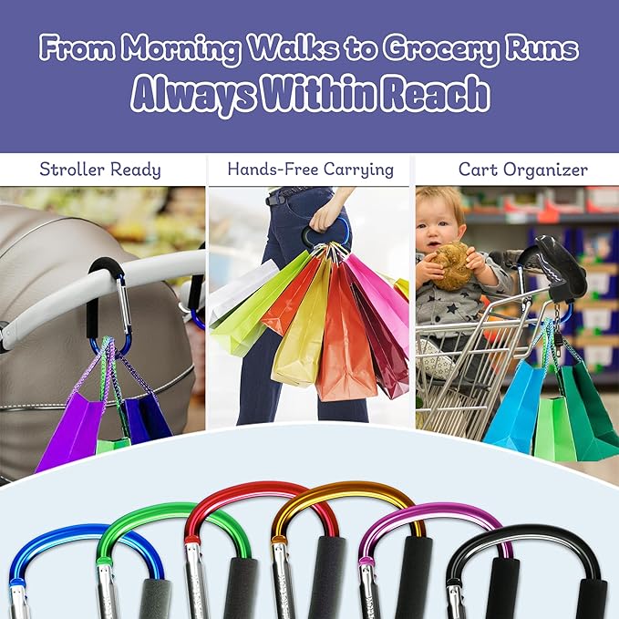 • Multipurpose Hanging Clip: Beyond stroller bag holders, the strong clip is ideal for carrying multiple grocery bags, attaching items to luggage, or organizing spaces like garages—offering versatile use for outings and errands
