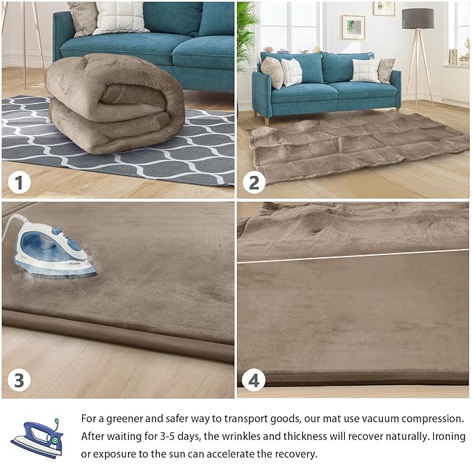• 🌟HOW TO CARE FOR YOUR MAT:When you open the package,it may be wrinkled,very flat and inelastic.Don't fret - this is normal! As long as it is left for 3-5 days, the mat will naturally regain its thickness and elasticity. we recommend steaming or ironing it to speed up recovery. After you have completed the steaming/ironing, your thick floor padded mat should rebound and be ready to use!