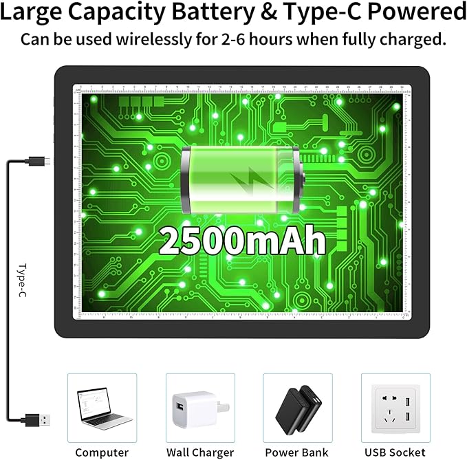 • 【 High Capacity Battery Powered Lightbox 】 With 2500mAh rechargeable lithium battery, the magnetic tracing pad can work continuously for 2-6 hours wirelessly. Convenient for you to use it anywhere in your home or on your journey. Equipped with upgraded fast charging Type C cable, easy to access any Type-C port, charging is fast and efficient. Both battery mode and charging mode are applicable. Also,the USB-C interface is more stable than the Micro interface.