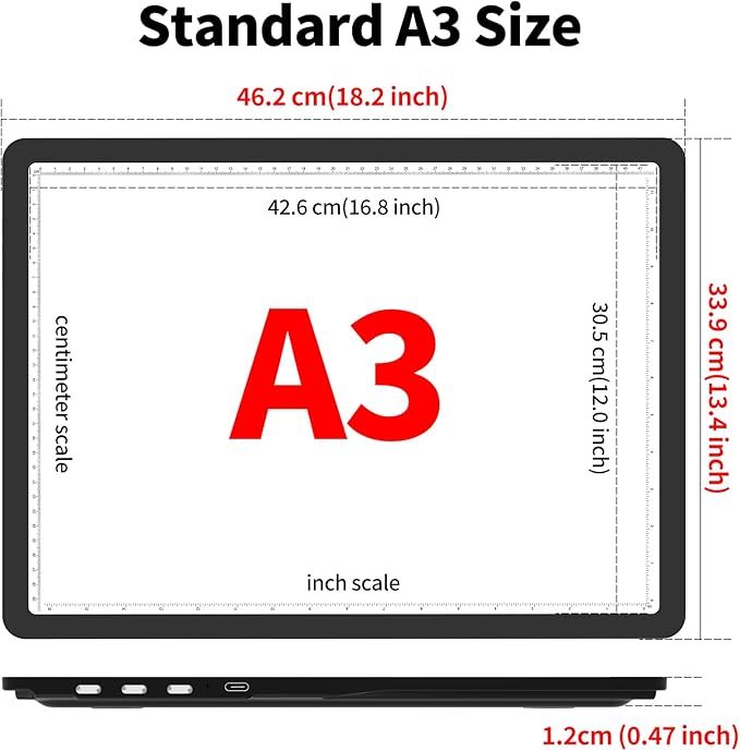 • 【 Standard A3 size, CM-INCH double scale 】 This Rechargeable super bright lightpad Overall Size is 46.2 x33.9 x 1.2 cm ( 18.2 x 13.4 x 0.47 inches ), and the visual working area is 42.6 x 30.5 cm ( 16.8 x 12.0 inches ). Illuminated area large enough for international standard A3 paper. This Light Drawing Sketch Pad has a dual scale of centimeters and inches to meet your various usage habits.