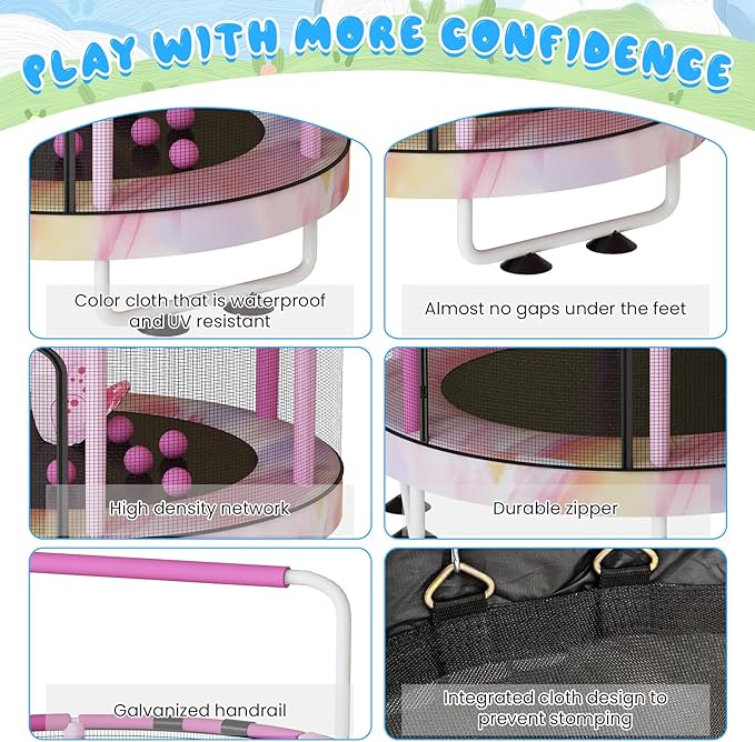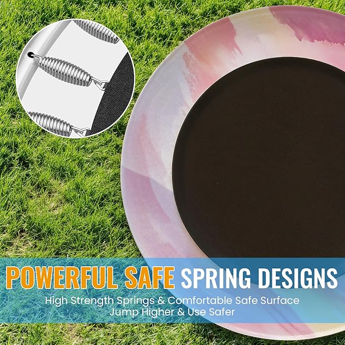 • ✨【360° Safety You Can Trust】Features a high-density enclosure net, anti-slip base pads, and 36 reinforced springs for maximum safety and support. ASTM-certified, giving parents peace of mind while kids play confidently.