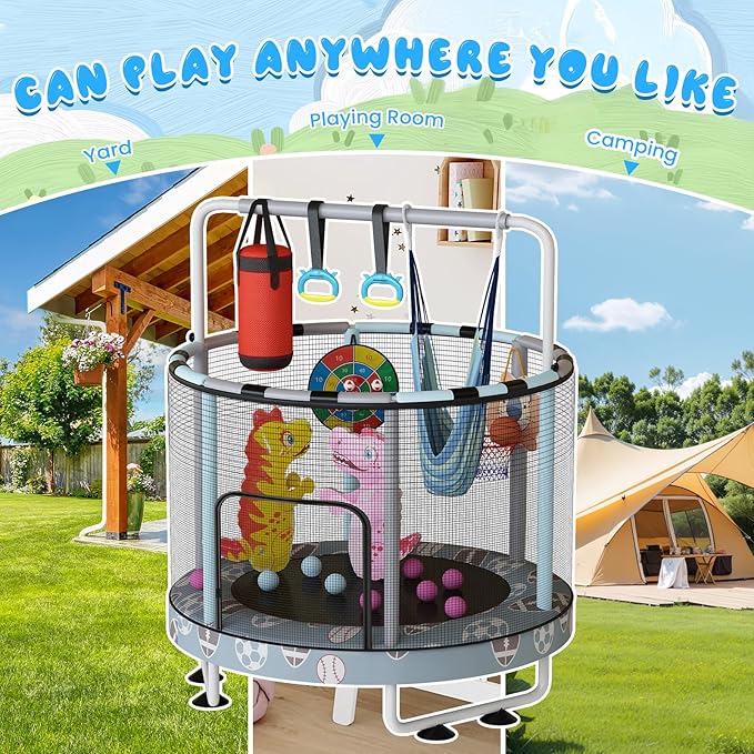 • ✨【7-in-1 All-in-One Play Center】More than just a trampoline—this versatile activity hub includes a swing, basketball hoop, dartboard, hanging rings, inflatable dinosaurs, and ocean balls. Keeps kids active and entertained while boosting creativity, coordination, and motor skills.
