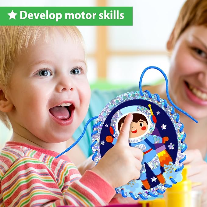Premium Foil Edge Lacing Cards for Kids Ages 3-6 | 5 Double-Sided Space Sewing Cards with Multilingual Learning | Durable Cardboard Fine Motor Skills Activity Kit