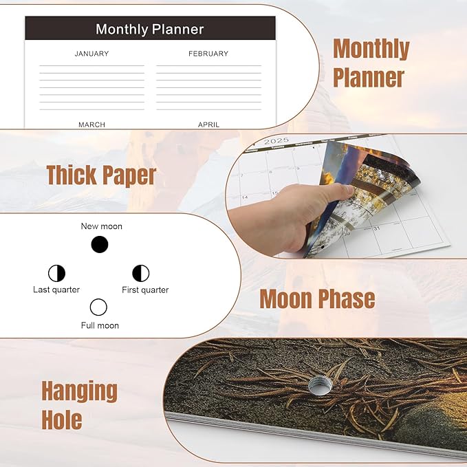 • 🏞️【Easy to Hang & Stickers】- The calendar 2025-2026 is easy to hang, each page is equipped with a well-positioned hanging hole, and the hanging hole is kept at a certain distance from the edge, not easy to break. We also include three stickers for your convenience to mark events. Additional monthly planner on the last page.