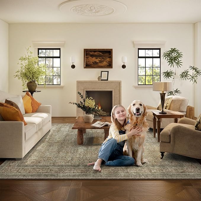 Washable Area Rugs for Living Room: 8x10 Bedroom Rug Boho Vintage Rugs Stain Resistant Non Slip Low Pile Lightweight Soft Carpets for Dining Room Kitchen Nursery Kids Room Farmhouse Living Room