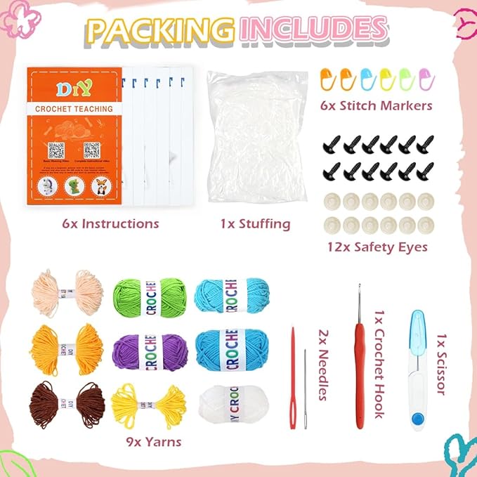 • 【ALL IN ONE CROCHET KIT】: Along with Easy Yarn and easy-to-follow video tutorials, you'll receive every other tool you'd need to begin crocheting with our kits. The beginner crochet kit also includes a scissors, a crochet hook, 2 needles, eyes, 6 marker buckles, cotton stuffing, 6 written crochet patten instructions and video tutorials.