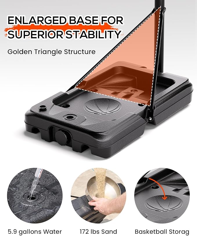 • Sturdy Base for Safety: Mayfire outdoor basketball hoop features a robust base that can be filled with 5.9 gallons of water + 172 lbs of sand, this portable outdoor basketball goal stays firmly grounded during aggressive dunks and fast-paced games—no wobbling or tipping