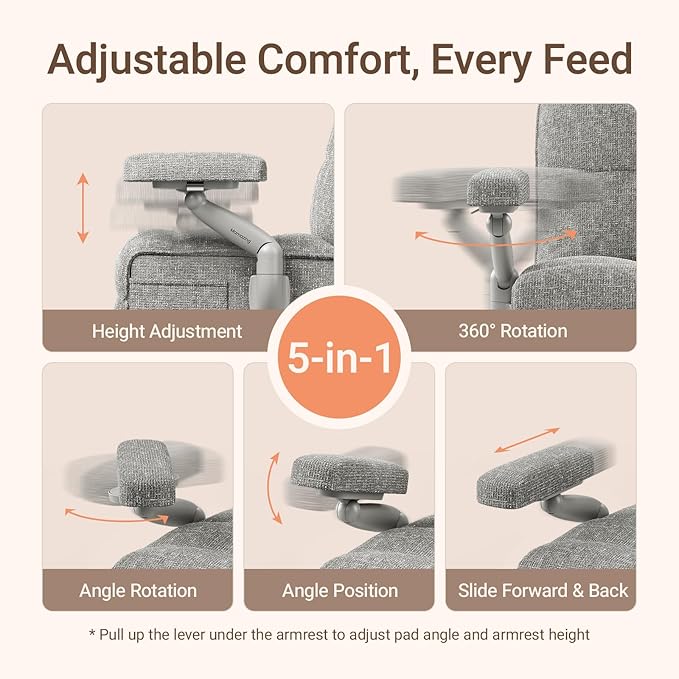 • π—¦π—œπ—Ÿπ—˜π—‘π—§ π—₯π—’π—–π—žπ—œπ—‘π—š & π—˜π—”π—¦π—¬ π—‘π—œπ—šπ—›π—§π—§π—œπ— π—˜ 𝗑𝗨π—₯π—¦π—œπ—‘π—š:Designed with a noiseless rocking (up to 25Β° forward/back) and 360Β° swivel feature, this chair gently soothes your baby to sleep without disturbanceβ€”ideal for midnight feedings. With a comfortable 16.5-inch seat height, it allows moms to sit down and get up effortlessly during frequent nursing sessions, making nighttime care easier and more restful