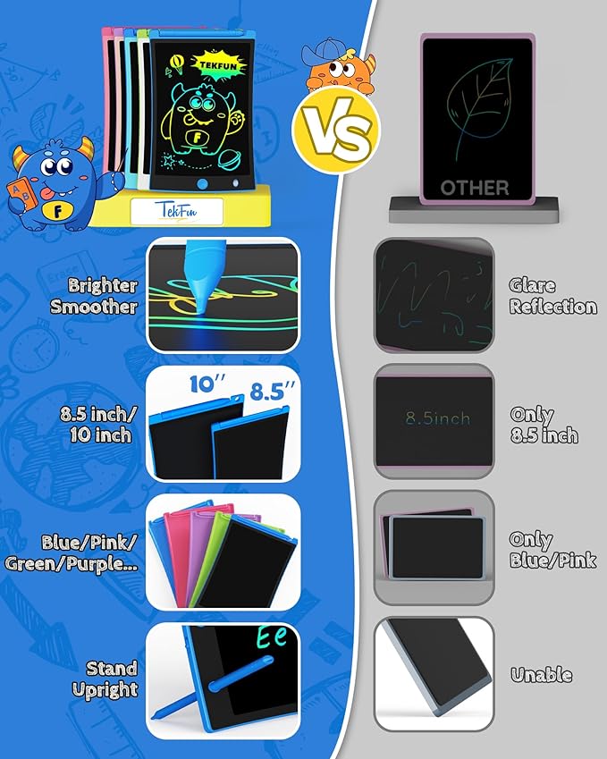 • Eye-Friendly: Say goodbye to blue light and glare with TEKFUN's LCD screen. Your child can draw for hours without straining their eyes, making it a great electronic alternative for preventing visual impairment