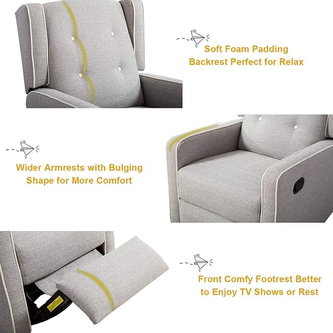 • High Backrest and Cozy Armrest - On the basis of fully relax your arms and body, this manual swivel rocker gliding chair is composed of upholstery button & track arm & a foam soft cushion & butterfly back.