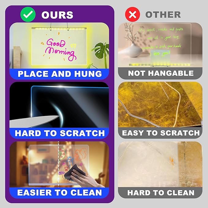 • Durable Build and Ideal Size: Crafted with acrylic material, this LED note board is made of premium water-soluble material, it stands up to frequent wiping and daily use without scuffs. At 11.9"X8", it provides plenty of space for creativity– ample room for kids’ drawings, family reminders, or brainstorming sketches. Sturdy yet lightweight, it balances durability with easy handling for all ages.