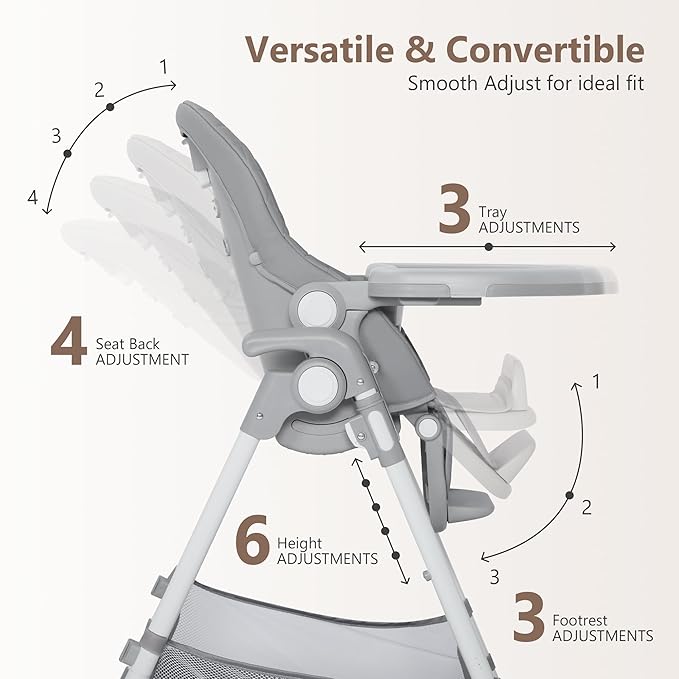 • Multifunctional High Chair: It can be converted to a Infant highchair, baby feeding chair, toddler high chair and child seat or more; Meet your various needs: 6 position height, 4 position seat recline, 3 position footrest, 3 position trays