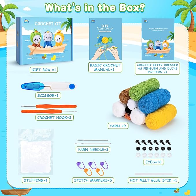 • All-In-One Crochet Starter Kit:Beginner crochet kit comes with everything you need to create cute crochet kit: enough yarn, crochet hooks, eyes, knitting markers, needles, stuffing, scissor, hot melt glue stick. In addition to the crochet supplies, the crochet kit for beginners kids includes beginner-friendly video tutorials, duck and penguin cat crochet pattern and basic crochet manual.